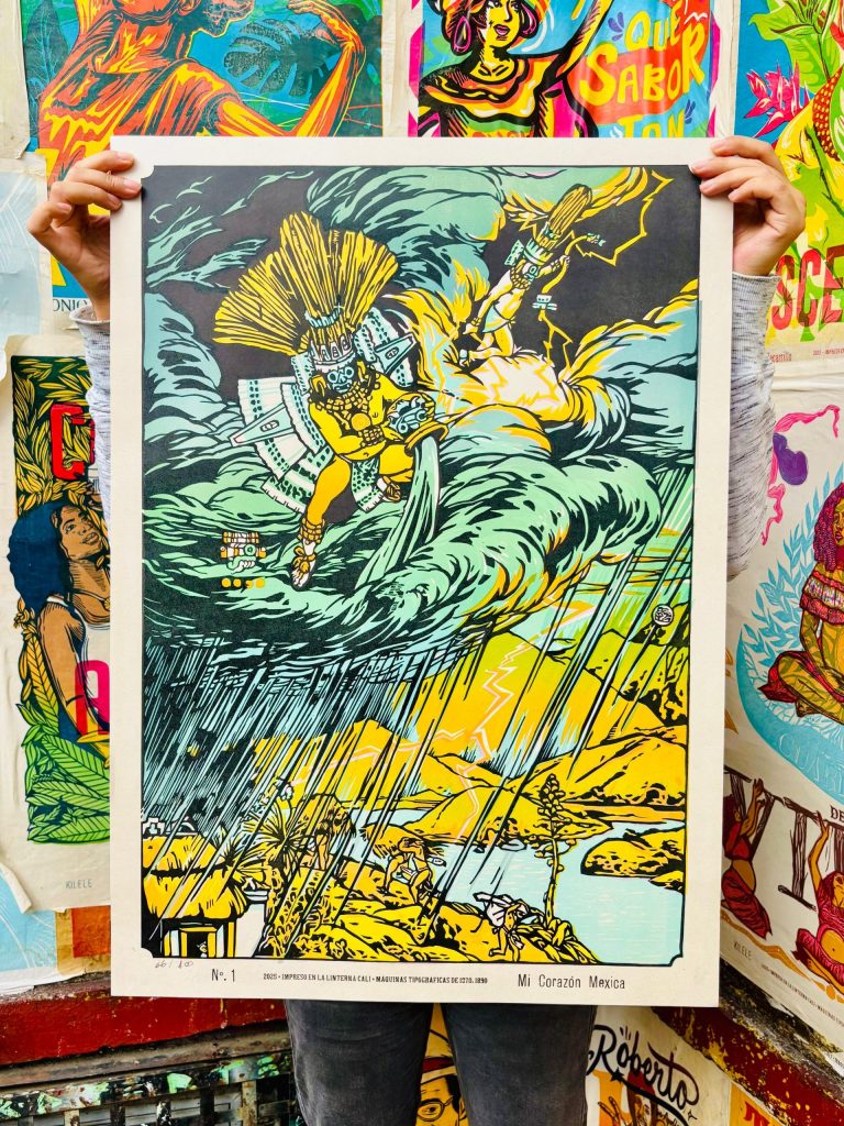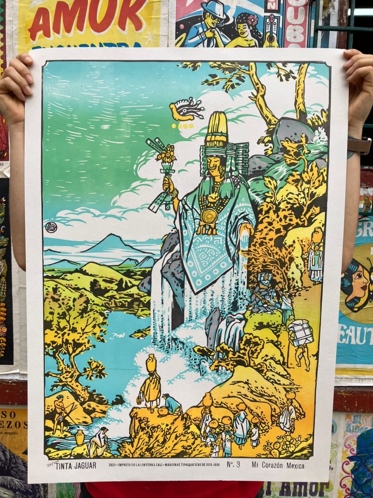 This poster was printed on 150-gram Earth Pact paper. The design was linoleum carved by “Resident Artists” and brought to life using antique printing presses dating back to the 1870s and 1890s.