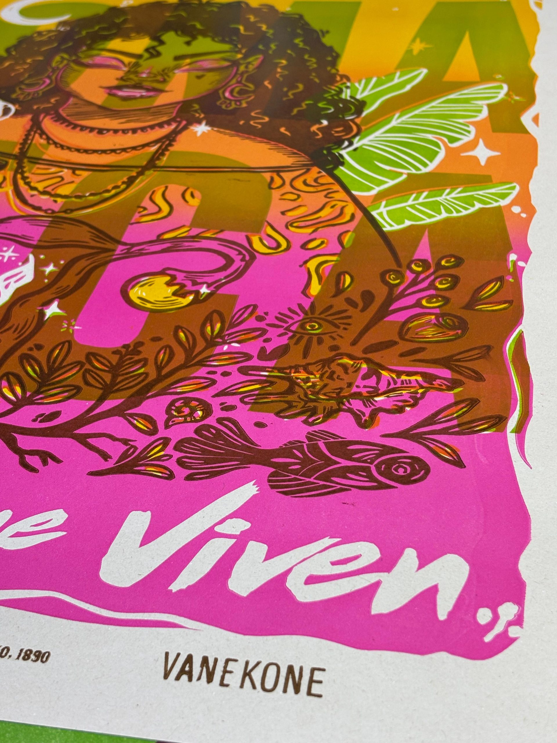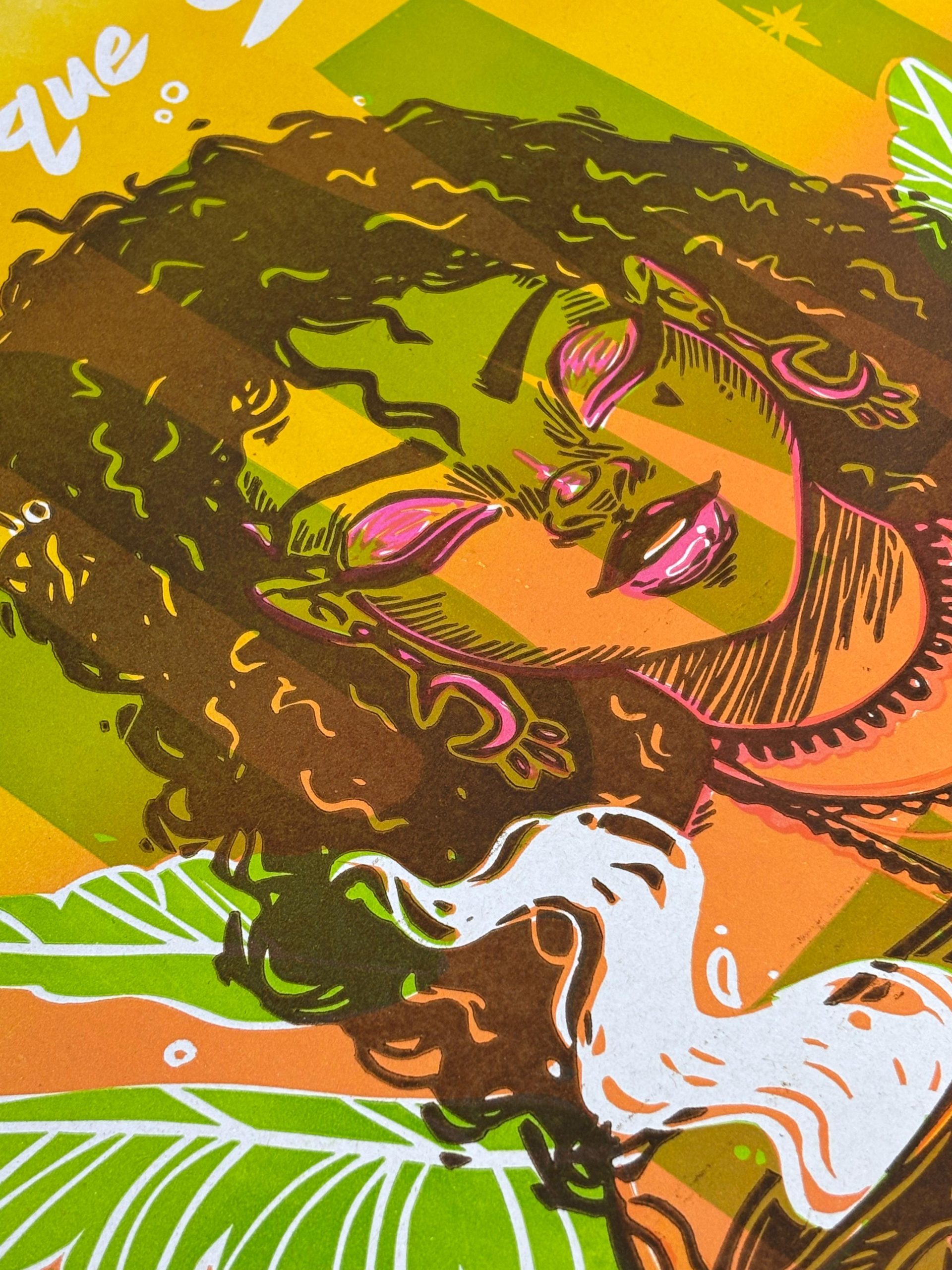 Poster printed on 150-gram Earth Pact paper, created from a linocut carved by “Resident Artists,” and printed on machines from the 1870s and 1890s.