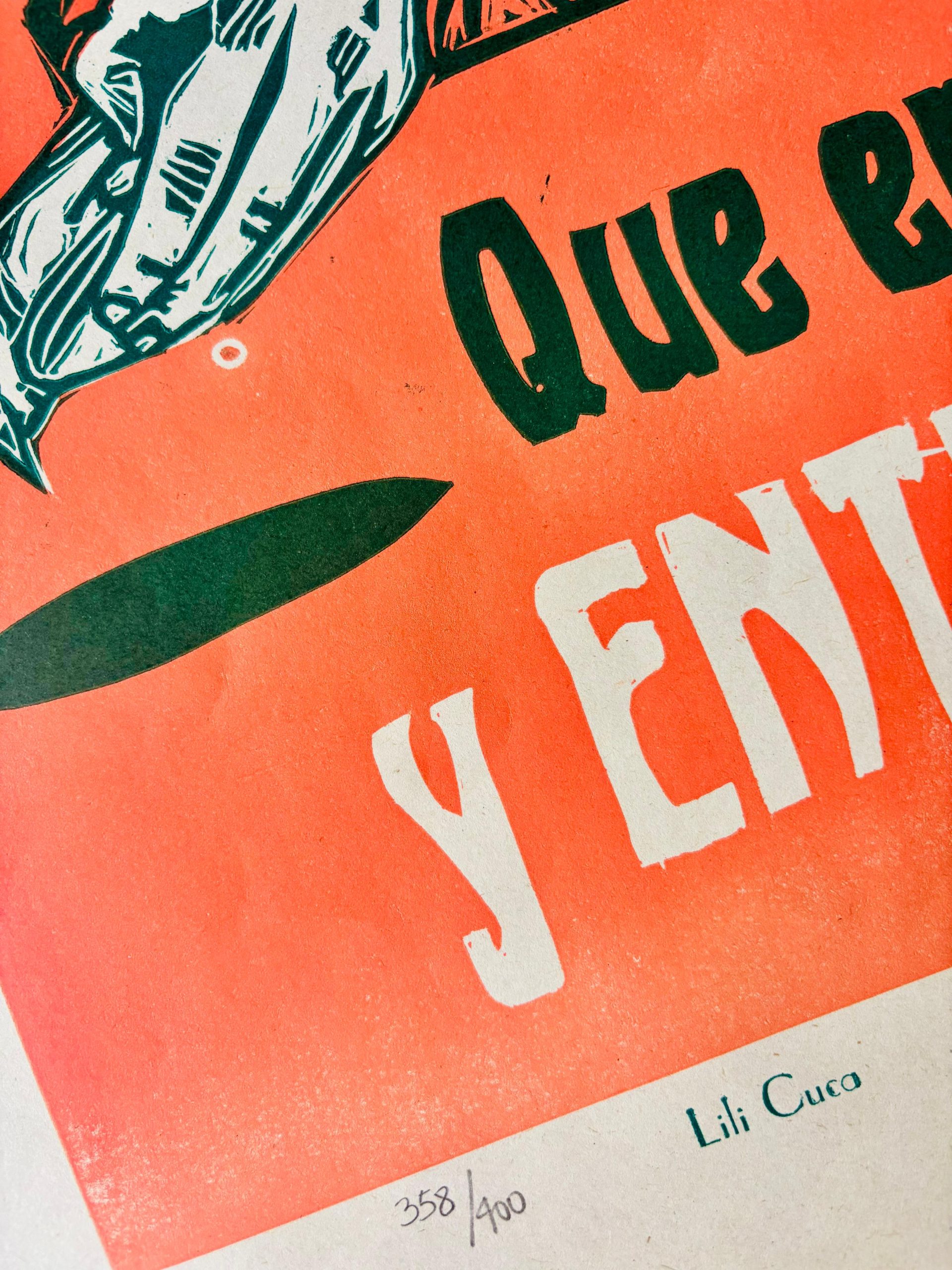 This poster was printed on 150-gram Earth Pact paper. The design was linoleum carved by "Resident Artists" and brought to life using antique printing presses dating back to the 1870s and 1890s.