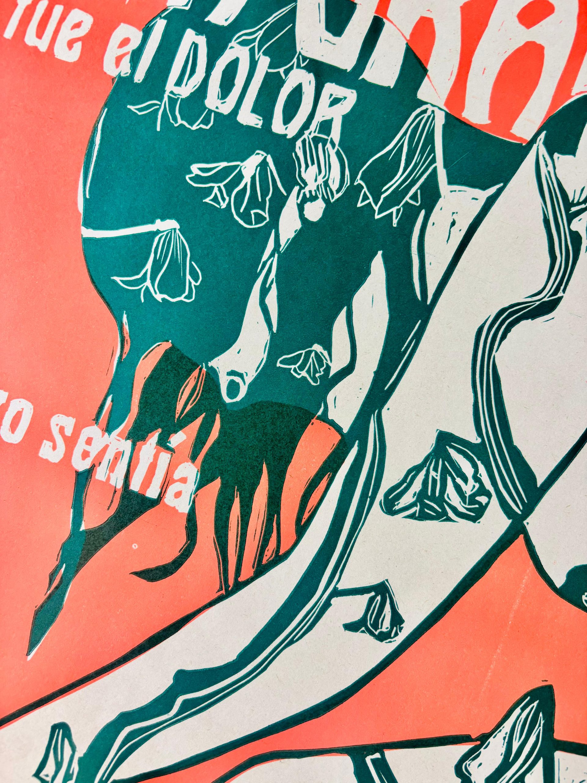 This poster was printed on 150-gram Earth Pact paper. The design was linoleum carved by “Resident Artists” and brought to life using antique printing presses dating back to the 1870s and 1890s.
